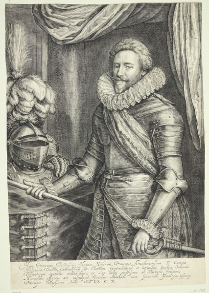 Editor: This is a rather striking engraving from 1608, "Portræt af Morits af Oranien" by Jan Harmensz. Muller. I'm fascinated by the incredible detail rendered in a simple print. What strikes me is the armor and the elaborate helmet...it's quite imposing. How do you interpret this work? Curator: Well, portraits like these often served multiple functions. Beyond mere representation, they’re steeped in symbolism and cultural memory. Look at the armor: what does it immediately suggest to you? Editor: Power, strength, protection… I suppose those are fairly obvious associations. Curator: Precisely. The armor and the helmet act as visible signs of his leadership. Notice, too, that he’s holding a baton, further signifying authority. Now, consider what is omitted; the artist included items alluding to conflict, not depicting war but leadership qualities. What psychological impact might this have on viewers of the time, or even now? Editor: I imagine it projects an image of steadfastness and control, reassuring people that their leader is capable and strong, especially during uncertain times. Curator: Exactly. The artist isn't simply creating an image, but solidifying a specific narrative about Prince Morits within the cultural memory. What starts off looking like 'just a portrait' reveals an engagement with public perception, memory, and enduring symbols of power. It speaks volumes about the period's understanding of leadership. Editor: I hadn't considered it that way before; now I realize the cultural weight behind even seemingly straightforward depictions. Curator: Indeed, it prompts us to contemplate which symbols persist and why they remain relevant through time.