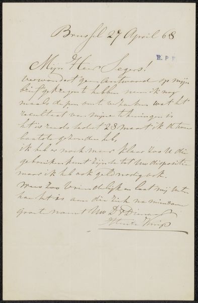 This is a letter to P. Segers by Henri Knip, dating back to 1868. Immediately, the stark contrast between the faded ink and the paper, aged with time, captures the eye. The composition is dominated by the dance of handwritten script across the page, a structural element in itself. The strokes vary in thickness and direction, creating a rhythm that leads the eye through the narrative. The placement of the text is strategic. It occupies the upper portion of the paper, leaving a vast, empty space below. The negative space is as crucial as the writing. It invites contemplation and encourages us to think about absence and presence, echoing the very act of communication—what is said versus what remains unsaid. Consider this letter not just as a historical document but as a study in form and space, where each element contributes to a richer understanding of communication.