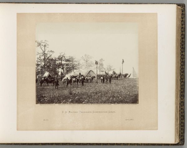 Curator: We’re looking at James Gardner’s photograph, “Field Hospital, Second Army Corps, Brandy Station.” Editor: The somber tonality perfectly conveys the grim reality of wartime medical facilities. The stark trees add a sense of foreboding. Curator: Indeed. Notice how the photographer uses the geometry of the tents and the central archway to create a carefully structured composition. The repetition of vertical lines is also notable. Editor: It certainly emphasizes the standardization of care within the Union Army, reflecting the institutionalization of medicine during the Civil War. This wasn’t simply a photograph; it was a document of military infrastructure. Curator: Quite. And the contrast between the light tents and the dark trees creates a visual tension. Editor: It is a striking image, both aesthetically and historically, leaving one to ponder the human cost of conflict. Curator: An insightful synthesis, providing a richer understanding of this poignant scene.