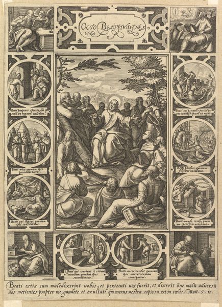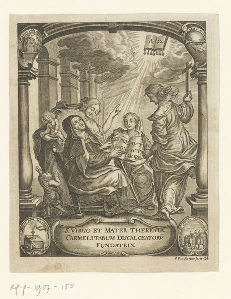 Editor: This is an engraving from 1648 by Cornelis Bloemaert, titled "Koning Ferdinand IV," or King Ferdinand IV. It's an intriguing depiction of the King, surrounded by allegorical figures. I am struck by how much symbolism is packed into one image, though the message is hard to decode right away. What do you see in this piece, beyond just a portrait of a king? Curator: It’s a fascinating example of how power was visually constructed and communicated in the Baroque era. Forget simple likeness; here, imagery conveys authority. Look at how Ferdinand is elevated, literally, above these female figures, who represent virtues and abstract ideas. Where do your eyes go? Editor: I immediately notice the woman holding scales—is that justice? And the babies—or are they cherubs? The symbols are very busy. Curator: Precisely. Justice, likely. Consider scales, traditionally associated with Libra, evoking a sense of equilibrium and moral balance, essential for governance. Notice too, where she directs her gaze: upwards, beyond the material plane to "Truth," itself a charged concept for the ruling class during this era. Those seemingly innocent 'babies' could hint at new beginnings or even divine blessings granted upon the King and his reign. It all speaks to the projected image of a divinely ordained ruler. What, then, is he holding? What does that imply? Editor: He holds a staff, so maybe he's a shepherd of his people? He looks a bit passive though, almost like a statue. It contrasts with the dynamic figures surrounding him. Curator: That “passive” statue-like quality underscores the idea of permanence and unwavering authority. The staff, yes, perhaps alluding to the Good Shepherd archetype. Consider this alongside other repeating elements, like light, the winged figures above him and its effect in establishing cultural memory of a noble monarch across future generations. Does it work or is it ultimately a cliché? Editor: It feels a bit over the top to my eye! But I understand how all the symbolism contributed to projecting an image of strength. Curator: Indeed. It reveals so much about the psychology of power and how visual language shapes our perception of leadership throughout time. It’s much more than a portrait, and closer to a persuasive piece.
