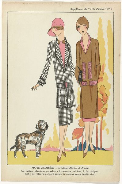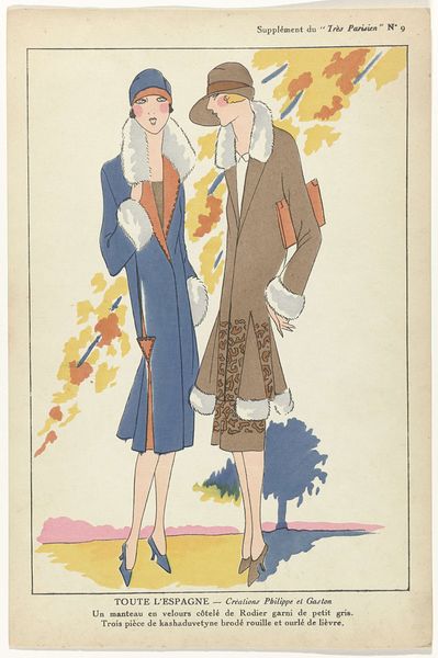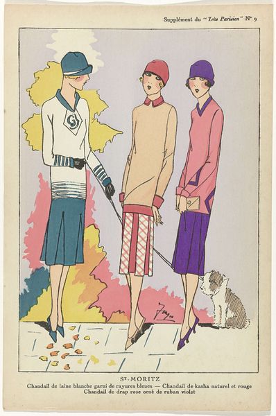 This fashion plate, printed in France in 1923, depicts three young women modeling the latest designs from Soeurrette, a Parisian fashion house. The image’s clean lines and geometric shapes reflect the influence of modernism on commercial art of the era. Fashion plates like this one played a crucial role in shaping consumer culture during the interwar period. They catered to an increasingly global market hungry for Parisian style. This plate appears in a series called "Très Parisien," explicitly associating its designs with the glamour and sophistication of Paris. It also suggests the importance of the fashion industry to the French economy and national identity. To fully understand this image, one could research the history of fashion magazines and the fashion industry. It would also be interesting to explore the representation of women in advertising and popular culture during this period. Fashion is both an art and a business, and always worth a critical look.