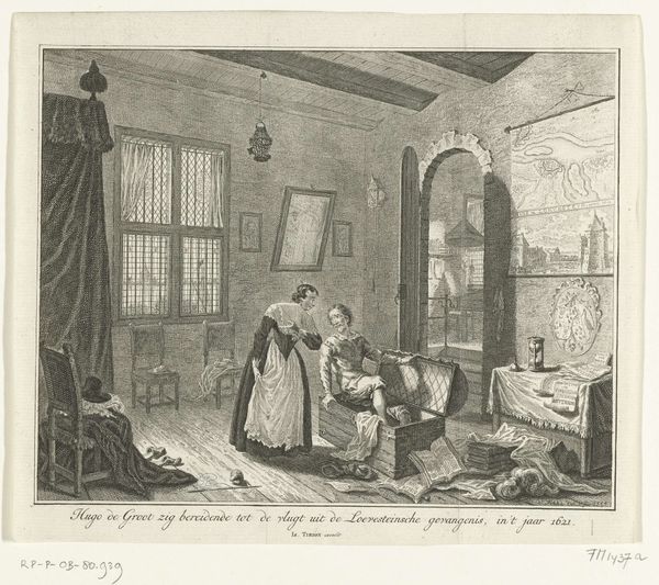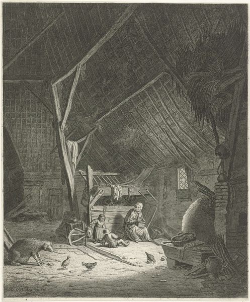 Pieter Nolpe created this etching, "Stal met koeien: het seizoen herfst," translating to "Stable with Cows: The Autumn Season," in the 17th century. The print plunges us into the shadowy depths of a barn, its diagonal composition drawing the eye from the lower left foreground to the upper right corner. Nolpe masterfully uses chiaroscuro to model space and light, casting the scene in a muted palette where subtle tonal variations define form and texture. The texture in this print is achieved through the marks left by the etching process. The image’s visual order is constructed through a series of binary oppositions: light versus dark, smooth versus rough, and near versus far. Cows stand placidly in their stalls on the left, while a woman engages in domestic labor to the right. Her presence marks a dynamic contrast with the stillness of the animals, her rounded form juxtaposed against the angular architecture of the barn. Ultimately, it is the interplay between these elements that gives the artwork its depth, inviting viewers to contemplate themes of labor, nature, and the human condition within the structured environment of the rural landscape.