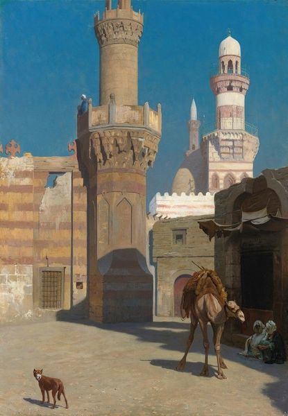 Curator: This is Edwin Lord Weeks' "Elephants at the Palace of Jodhpore," an oil painting depicting a scene in India. Editor: It feels very textured and opulent. The golden hues of the elephants' decorative cloths are dazzling, contrasting beautifully with the dark grey beasts. There's also an unusual interplay of formality with that ram, a strange yet welcome intrusion into the overall scene. Curator: Weeks was fascinated by the "Orient" and this piece exemplifies the Orientalist style of the time. It's interesting how he uses impasto techniques to bring a tangible materiality to the grandeur he depicts. It speaks volumes about the value placed on handcrafted luxury. Editor: Right, I'm particularly drawn to the architectural backdrop, the facade appears almost fortress-like. Note how the walls’ surface is contrasted by the darker interiors and the vibrant colors and implied sounds of the costumed figures at the entrance. This evokes the city's public role as a center of power, displaying both wealth and formidable defenses. Curator: Considering Weeks' body of work, one can't help but analyze the ethics of representation. The focus seems to fetishize exoticism for a Western audience. The application of the medium seems to flatten cultural difference into an easily consumable aesthetic experience. Editor: Precisely! The museum's presentation itself reinforces those power dynamics; how do we avoid reiterating colonial gazes, particularly for contemporary viewers encountering the artwork within a contemporary social discourse? Curator: Well, by continuing such dialogues, acknowledging the socio-political undertones while still appreciating the skill and materiality involved, we are already helping. Editor: Agreed. Highlighting the labor and artistic intent in creating this painting offers viewers a richer, more nuanced understanding that extends beyond a simple aesthetic assessment. The goal is to facilitate a critically engaged art experience for everyone involved.
