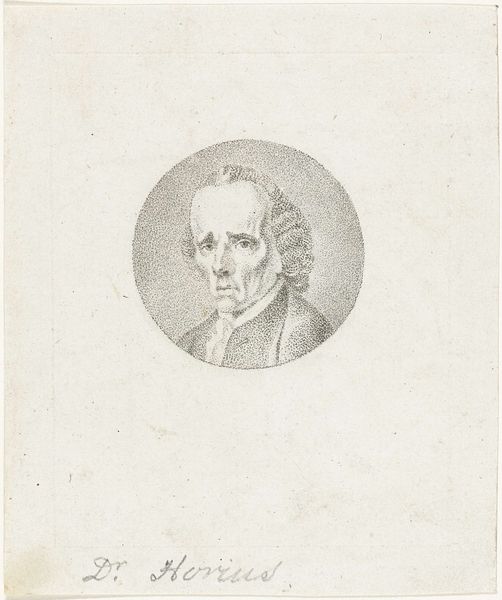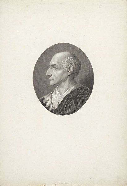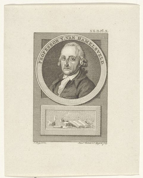 Curator: Ah, here we have “Portrait of J. Hovius at the Age of 16”, a print made around 1786-1788. It’s an engraving, that intaglio process creates such lovely fine lines. Editor: There's an immediate intensity about him, despite the formal setting. He's almost caught off guard, don't you think? Those shadows beneath his eyes give the air of an older, perhaps world-weary soul trapped in youthful confines. Curator: Indeed. It’s interesting that it was made by Jacobus Buys. What sort of symbology do you read into it? Editor: Well, it's framed within that tondo shape, so familiar from classical antiquity – which points to Neoclassical influences. This isn’t just a likeness; it’s about positioning the sitter, young Hovius, within a particular cultural lineage, connecting him to those ideas. The choice to use black and white engravings speaks of morality and intellect rather than decadence and wealth. It’s so subtle but powerful, isn't it? It also notes that he died April 6 1786. The pose does resemble symbols from that period that mark memorial. Curator: That’s a piercing thought, thank you! His somber expression really adds to your vision, so moving and insightful. Editor: But there is also something inherently modern about this memorial in disguise of the portrait; that penetrating gaze feels so deeply human! Maybe it also offers insight into that strange mixture of grief, anxiety, and desire during youth. A powerful connection. Curator: It makes me wonder what Hovius was really like as a young man. What dreams or fears lived behind those somber eyes? Editor: Precisely! An artwork should linger long after we’ve moved on to the next. This one certainly does that.