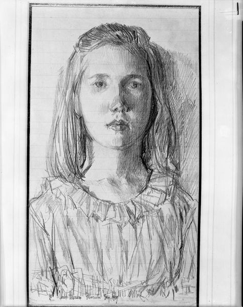 Curator: The Harvard Art Museums presents "Portrait of a Girl (Harriet J.)" by Childe Hassam. It looks to be a pencil sketch. Editor: It's captivating! The stark contrast between light and shadow gives it such a raw, almost unfinished quality. Curator: Hassam was known for his oil paintings, but this sketch reveals his mastery of draftsmanship, the materiality of graphite on paper. What labor went into this seemingly simple study? Editor: The sketch embodies late 19th-century aesthetics. Consider the accessibility of portraiture at this time, how images circulated, and the rising bourgeois desire for likenesses. Curator: Exactly, but what about the material conditions allowing Hassam to produce it? Paper production, graphite mining… Editor: A fascinating snapshot into the cultural landscape of portraiture at the time. I wonder who Harriet J. was and what her place in society might have been? Curator: It all speaks to the broader structures that shaped art production and consumption. Thanks for diving into it with me. Editor: Agreed! A wonderful example of how art reflects and shapes our understanding of history.
