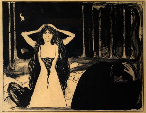Edvard Munch created "Summernight. The Voice" using woodcut and lithography, combining the graphic qualities of both. Munch was interested in the textural possibilities of wood. Here, he exploits the wood's grain to bring out the raw characteristics of his chosen material. Note how the lines run vertically in the landscape. The woman is set against this backdrop, dominating the scene. The crude gouges, scratches, and hatch marks create contrast, and add visual interest to the woodblock print. The woodcut technique added an element of labor-intensive craft to what was at the time a modern medium. Munch's innovative approach broke the boundaries of traditional printmaking, by using craft-based techniques. This reminds us that "fine art" and "craft" often intertwine, enriching each other.