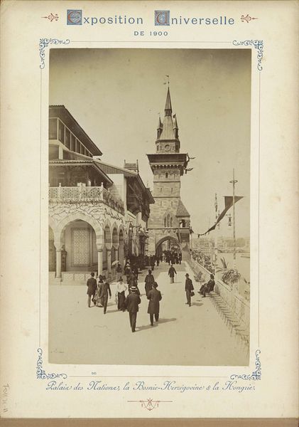Curator: This photograph by Andries Jager, taken in 1874, captures the gatehouse at the entrance of the Natura Artis Magistra zoo. The title itself indicates it was constructed to celebrate King Willem III’s 25th jubilee. Editor: It's such a stately structure, almost theatrical. It feels both monumental and strangely faded, like a scene from a play where the grandeur is only a backdrop. The light and shadow make the ornamentation quite imposing. Curator: Indeed, the photograph, created as a print, serves as a visual record of the era's pomp and circumstance. The gate wasn’t just an entrance; it was a symbolic gateway celebrating royal power intertwined with civic identity. Consider also that public spaces were being redefined in the late 19th century and the creation of landmarks like these became important displays of civic pride and national identity. Editor: Which also underscores the power dynamics at play. Who gets access, who feels welcome in these "public" spaces, becomes a relevant question. This celebratory monument becomes a tool for social messaging. Curator: Exactly, and Jager’s photo allows us to investigate how this imagery worked in consolidating those ideas. How did these monuments promote specific narratives through their design? The location too adds to the understanding, in front of a zoo, an important display of colonial ambitions at the time. Editor: Right, the men captured casually standing nearby could also be viewed as carefully constructed representatives of Dutch citizenry. Looking at the way it’s constructed now makes me more critical of public celebrations. Curator: It brings forth interesting discourse, I must agree. Editor: By understanding its cultural significance, we can appreciate that Andries Jager's photograph immortalized a carefully curated public statement that reveals a moment in history rife with displays of power. Curator: And in doing so, highlights the intersection between politics, public spaces, and photography as an important social documentation tool.
