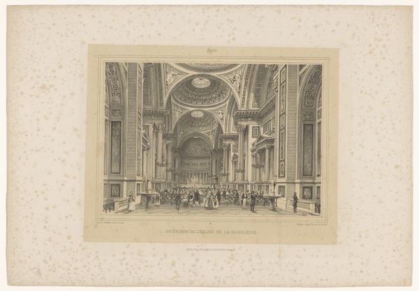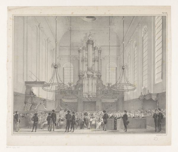 Franciscus Bernardus Waanders created this print of the Foot Washing by the Pope on Maundy Thursday. The work is defined by a strict architectural perspective which creates a deep, receding space, pulling the viewer's eye far into the Basilica. Observe how the artist uses the repetition of vertical lines in the columns to emphasize the grandeur and height of the space, and to convey the power of the church. The controlled lines and structured composition evoke a sense of order, typical of academic art. Waanders frames the scene with an ornate border, contrasting the linear precision within the image. This juxtaposition creates a visual tension, questioning the relationship between the central event and its representation. What does it mean to frame a ritual of humility within such elaborate ornamentation? The combination of detailed interior and decorative frame serves not only to depict but also to interpret the cultural and spatial dynamics of religious authority.