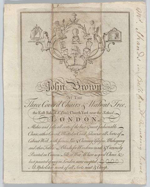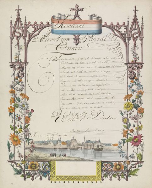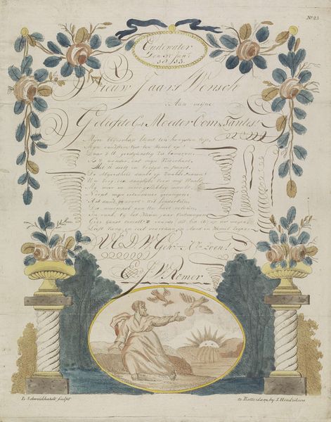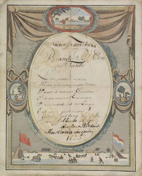 Curator: Look at this tender greeting, titled "Wensbrief met twee jongens en landschappen," which translates to "New Year's Letter with Two Boys and Landscapes," dating roughly from 1792 to 1847. It's currently held at the Rijksmuseum. What do you think of this whimsical artwork? Editor: Oh, my goodness, it feels so delicate! The pastel watercolors create such a gentle atmosphere. And the two little figures up top… they seem to be barely holding onto the text! A mix of hope and fragility, perhaps? Curator: I'd say you've intuited the sentiment exactly! It’s done using pen, watercolor, and paper and has a heartfelt poem inscribed right in the middle. Notice the idyllic landscape vignettes set like jewels within the architectural framing? Editor: Yes! Each one is like a miniature world. Look, there's a church steeple, and figures strolling by a river... there's a sense of piety but also, significantly, a reverence for nature woven in. Were these landscapes particular places or something more allegorical, perhaps reflecting stages in a journey? Curator: Absolutely! This artist, Hendrik Moolenyzer, utilizes a combination of portrait and landscape styles with themes leaning into genre-painting, so it captures intimate family and communal scenes and the quiet drama of ordinary life as reflections of the sublime. Editor: Ah, I see. Like small windows into the daughter's affections and thoughts for her parents on this New Year. These embedded landscapes also speak to the idea of memory—of cherished places forming our emotional landscape. It almost transforms into a blessing, each landscape like a miniature Eden. Curator: Such keen observation! It allows a peek into the lives and ideals of that time with grace and subtle poignancy. It makes me want to know more about the family who sent this letter! Editor: Me too. I suppose these humble mementos allow a look at humanity through the visual symbols of the day. Now, what deeper stories do these figures and settings whisper from across the years?