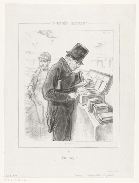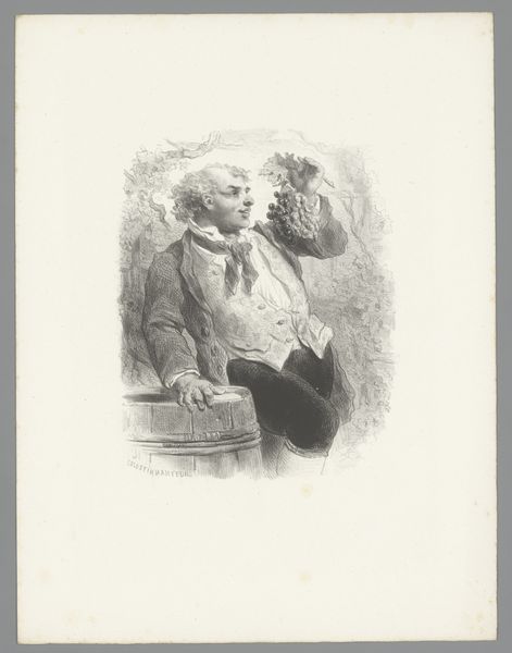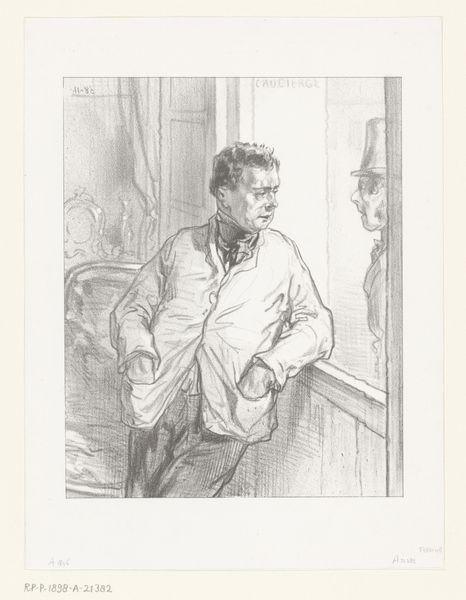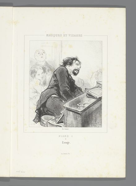 Editor: So, this is Paul Gavarni’s "Pianist," a pen drawing from 1853. It’s currently held at the Rijksmuseum. It feels rather… intimate, doesn’t it? The lone figure hunched over the piano. What do you see in this piece, looking at it from a symbolic point of view? Curator: It speaks of the hidden languages within us all. The pianist here, seemingly lost in his own world, evokes a powerful cultural memory: music as solace, as escape. Notice how Gavarni has positioned him: almost as if he's barricaded himself behind the instrument. Editor: That's interesting. I hadn't thought about it that way, I was too caught up in the man's introspective look. Curator: And that’s precisely the trick! The instrument is both a source of joy *and* a barrier, it highlights how creative expression can simultaneously connect and isolate us. The draped curtain behind him could also be seen as the theatre, perhaps symbolising that there is an element of performance in all that he does? Is this individual, alone with his instrument, actually seeking to connect with a wider audience? Or is he just looking inwards, in an act of self-analysis? Editor: Wow, so it’s almost like the drawing contains these opposing ideas within itself. Curator: Exactly! Romanticism thrived on these tensions, internal struggles made visible, expressed by an individual but representing something that is universal, shared between us all, in a language we call all access if we dare to look within ourselves. Editor: I see! Looking at it this way, the drawing becomes a meditation on art, loneliness, and expression. Thanks! Curator: My pleasure. This image reminds us that even seemingly simple depictions of everyday life are fertile grounds for exploring profound truths about ourselves, if you just know where to look for it.