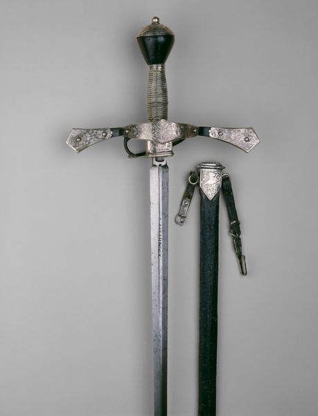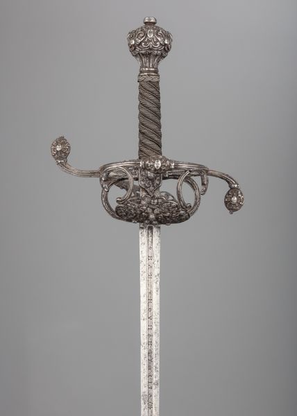This rapier and scabbard, made by Antonio Piccinino, is a study in contrasts: the stark, gleaming blade against the intricately worked, dark metal of the hilt. The eye is drawn to the hilt's complex geometry – a cage of swirling forms that both protect the hand and create a dynamic visual composition. The structure of the rapier transcends mere functionality; it embodies status. The meticulously detailed patterns on the pommel and guard, with their symbolic weight, speak to a culture steeped in heraldry and social stratification. But this weapon is not just about show. The elegant, tapering blade suggests a refined, lethal purpose. The rapier embodies a paradox: it is both an instrument of violence and a piece of carefully wrought art. Consider how the linear form of the blade, marked with precise inscriptions, contrasts with the ornate, almost baroque quality of the hilt. This interplay suggests a tension between order and chaos, control and passion, reflecting the complex mindset of the Renaissance warrior.