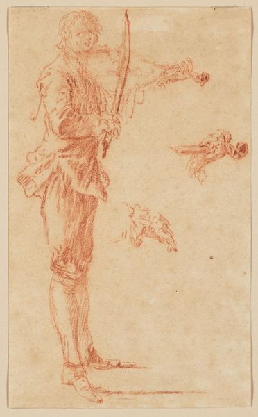 Editor: This is "Paar op de rug gezien," or "Couple Seen From the Back," a pencil drawing on paper made sometime between 1757 and 1824 by Cornelis Adrianus van Hoogstraten. The detail in the clothing is incredible, but I'm mostly curious about the relationship between the figures. What do you see in this piece that tells a larger story? Curator: It is interesting to note that, even with their backs turned, the cultural coding within their clothes and posture tells us much about their possible roles. What feelings are evoked by their stance, their implied destination? Does their proximity suggest familiarity, or are they merely traveling the same path? Editor: I'm seeing familiarity...maybe even intimacy? The way they seem to lean toward each other, and their similar head coverings… it hints at a shared life. Curator: Exactly. And consider the simplification of form, the anonymity achieved by obscuring their faces. This elevates them beyond mere portraits into symbols. What archetypes might they represent? Think of the universal images of couples walking through life, together. How does the artist manage to convey shared experiences? Editor: Hmm, so the drawing becomes less about these specific individuals and more about the broader human experience of companionship? The sketchiness also helps, in a weird way. Curator: Precisely! Van Hoogstraten reduces them to near silhouettes. Notice how the light emphasizes certain folds in the fabric, and shadows that create depth, which draws us into that idea of connection and perhaps a journey. Editor: That's amazing, I never would have picked up on so much from just their backs! It makes you wonder where they are going. Curator: And isn’t that the essence of art sometimes? The artist plants the seed, but our experiences cultivate the meaning. This sketch really showcases the artist’s capability to imply rather than overtly tell a story of togetherness.