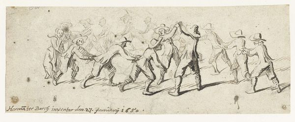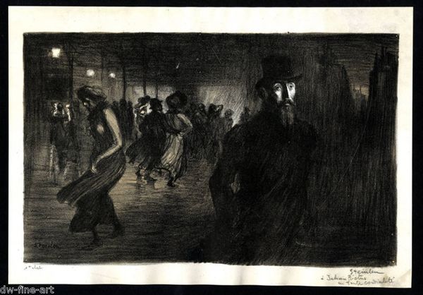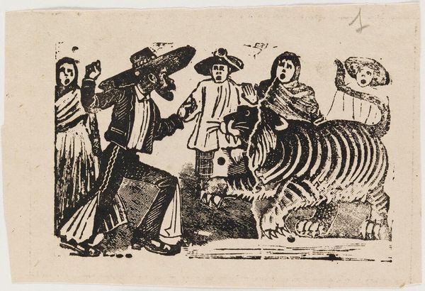 Curator: What strikes me immediately about this woodcut is the frantic energy, a sense of chaotic flight conveyed through these stark black and white contrasts. Editor: Precisely! This is "The American Mosquito" by José Guadalupe Posada, from the collection of the Harvard Art Museums. Posada was a hugely influential Mexican printmaker. Curator: The figures are all so clearly delineated, yet their forms feel almost like silhouettes, running from unseen forces. Are those mosquitoes represented as dark, winged shapes? Editor: Indeed. They're depicted larger than life, symbols of annoyance, perhaps even broader social and political critiques disguised as mere pests. Note how the attire of these figures suggests class distinctions. Curator: So this wasn't just about insects, but perhaps about social inequalities, or even foreign interventions, portrayed through the metaphor of a mosquito plague? The visual language is striking. Editor: Exactly. Posada used powerful, accessible imagery to comment on the societal anxieties of his time, leaving a lasting legacy on Mexican art and political expression. It's more than just a pesky mosquito.
