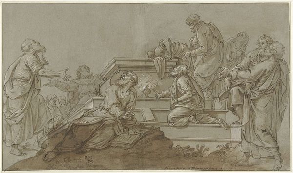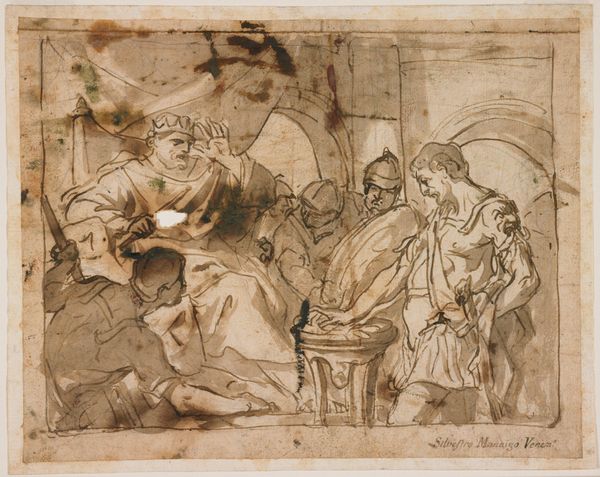 Editor: So, here we have Simon Vouet's "Ulysses and His Soldiers at the Table of Circe," a drawing, undated, at the Harvard Art Museums. It feels…almost dreamlike. The lines are so fluid. What strikes you most about it? Curator: You’re right, there’s a sense of fleeting vision. I see Vouet grappling with a grand theme – temptation, transformation – sketching out not just figures but a whole atmosphere of enchantment. Imagine yourself in Circe's hall. What would you be wary of? Editor: The food, definitely. So, the scene is more than just a depiction of a story; it's about capturing a psychological moment. Curator: Precisely! Vouet invites us to ponder the seduction of the senses and the fragility of human will. Editor: It's amazing how much narrative he conveys with so few lines. Thanks, this drawing has a new depth for me now. Curator: And for me! It's a good reminder that even the most fleeting sketch can hold profound truths, if we dare to look.
