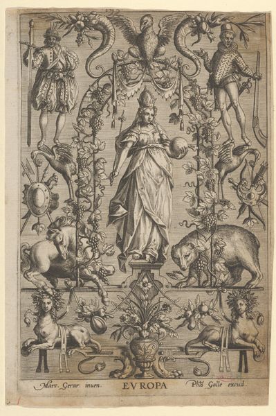This is "Classical Allegory with the arms of the Ochsenfelder," made by Virgil Solis in the 16th century. It's an engraving, meaning the image was incised into a metal plate, likely copper. Ink was then applied, and the plate pressed onto paper. The material here is critical to understanding the image. Printmaking allowed for the relatively quick reproduction of images. This was essential for disseminating ideas in the Renaissance, particularly as literacy increased. The sharp lines and precise detail we see were possible because of the engraver's skill with metal. Solis was part of a workshop system, so this print also testifies to the division of labor characteristic of early modern Europe. The act of printing itself, with its reliance on mechanical reproduction, speaks to the rise of a new kind of visual culture, one that emphasized distribution and accessibility. This is where art begins to meet the wider world of commerce and communication.