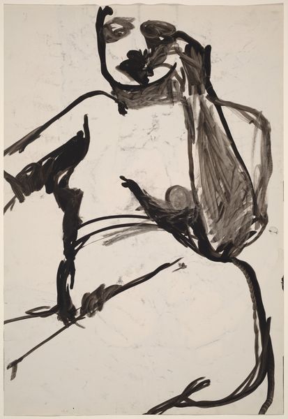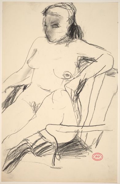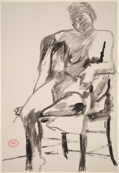 Curator: This ink drawing, “Untitled [seated female nude in a high back armchair],” by Richard Diebenkorn, dates from the mid-1950s to the late 60s. What's your immediate take on it? Editor: Brooding, a bit severe. It’s minimal yet it captures something very palpable in the sitter’s posture and face. Almost like an existential ache. Curator: I see it too! Notice how the stark ink lines carve out the figure's form but also seem to confine her. The chair itself—a high-backed throne, almost—becomes a sort of cage. I feel the tension between confinement and freedom. It reminds me of ancient Egyptian art—think of the seated scribe, eternally poised in the act of capturing information! It all relates to power... Editor: Right. The act of portraying a nude – is it empowering, or objectifying? That contrast is strong here. The chair’s almost skeletal form gives an impression of support and constraint at the same time. The subject's gaze holds a weight of knowledge; her slight slouch implies weariness, suggesting a history carried within. It almost reminds me of the cyclical iconography around the Crone archetype. Curator: Absolutely. Think about the historical context. This work emerges from a period marked by shifting gender roles and social expectations for women. Diebenkorn's figure resists easy classification. She's not idealized, but her gaze carries this intelligence. Editor: She challenges the conventional idea of beauty and poses a certain kind of power—perhaps intellectual, introspective. The lack of extraneous detail enhances this feeling. Everything is reduced to the core essence of form and presence. It leaves much for our imaginations to wander. Curator: I completely agree. It really makes you wonder, doesn’t it? Diebenkorn’s masterful economy of line achieves a complex representation of selfhood. Editor: It's certainly a memorable and unsettlingly honest artwork. Something to hold onto.