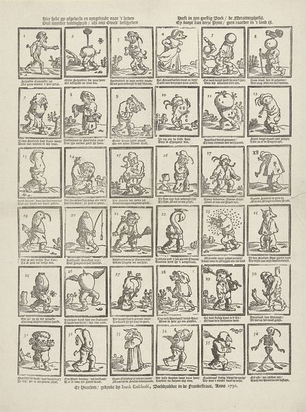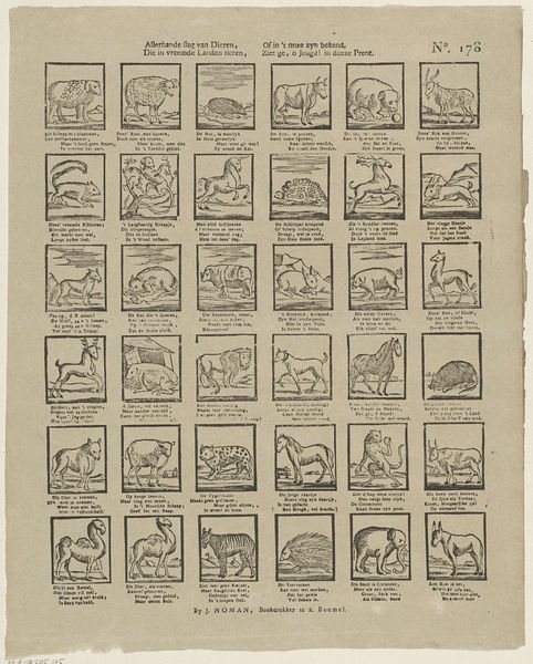 This print of assorted images was made in Amsterdam by Mindermann and Company. The images are accompanied by short rhyming verses in Dutch, suggesting it might have been a children's educational tool or an amusing pastime. In the absence of a precise date, we can analyze the cultural references and visual codes for clues. The presence of certain animals and objects, alongside the style of dress depicted, indicate a setting rooted in Dutch society of the time. The references to nature, domestic life, and social interactions reflect the values and interests of the Dutch middle class. As historians, understanding the function of this print requires exploring Dutch social and cultural history. Through archival research, we might uncover how such prints were circulated, and consumed within Dutch society, thus revealing more about their intended audience and the messages they conveyed.