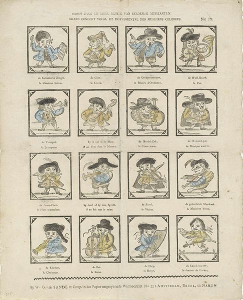 This print, "Groote zang en muzijk van beroemde muzijkanten", was created by Erve Wismuller. It consists of a grid of sixteen small images, each portraying a musician with their instrument. The colour palette is simple with blues, reds and yellows dominating the image. Each musician is framed within a decorative border, creating a structured, almost taxonomic layout, but the cartoonish figures, with their exaggerated features and poses, disrupt any sense of formal order. This tension between structure and playfulness invites us to decode what is being communicated. The semiotic system at play here is a cultural commentary. The print engages with the concept of representation itself. The arrangement of musicians in a grid-like fashion suggests a system of classification. The artist challenges our understanding of representation by turning these musicians into stylized, almost caricatured figures which are more about cultural interpretation and less about true representation.