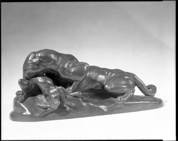 Curator: Looking at this sculpture, "Liggende barn, der kæler for en kat"—"Child Lying Down, Cuddling a Cat," created in 1887 by Georg Christian Freund, the most striking thing is the air of vulnerability and comfort emanating from this scene. What's your initial take? Editor: My first impression? Limestone. I mean, beyond the obvious domestic tableau, it's really about the texture, right? You see the tool marks left by the carver, almost celebrating the process of subtraction that brought it into being. Think about the labor and sheer time! Curator: You are absolutely correct about the materiality. But it is hard for me not to wonder about the choice to capture such an unguarded moment of peace between a child and an animal in, as you point out, stone. What do you make of the potential commentary, if any, implicit in transforming an everyday scene into something more permanent and seemingly significant? Editor: Well, permanent maybe isn't the right word. Limestone, being a somewhat soft material, invites erosion, you know? Consider this realism—how does Freund manage to give us both an enduring and fleeting moment in working-class existence through this medium? Does it suggest that our fleeting experiences leave some mark? The constant rub of children petting these animals every day for comfort might wear them down like water over rocks. Curator: It is not lost on me what seems like a rather conventional motif within 19th-century realist sculpture: A child alongside an animal. However, in stark contrast with, say, a confident dog and owner that signify wealth and power, here we see a vulnerable boy with what looks like a similarly scruffy kitten. As you point out, limestone suggests both lastingness and decay. Freund seems more preoccupied with tenderness rather than ostentation. Editor: Yes, and tenderness is a commodity too. Where was it shown? Who bought it? Domestic tranquility wasn’t some universally accessible experience; even representing that scene in limestone carries its own class baggage, don't you think? I wonder about Freund’s position in this. Curator: That's an incisive observation. Considering Freund's own bourgeois background, one might perceive an element of sentimentality or perhaps even an idealization of simple pleasures. It urges one to reflect on the intersection of the artist's vision and the realities of the world that inspired it. It invites empathy while hinting at the complex web of production. Editor: Absolutely. It layers the labor of crafting onto our reflections of work and living conditions within the work! So, next time you look at “Liggende barn, der kœler for en kat,” let's not just see sweetness. Think about the hands that made this, what limestone even *means,* and whose stories are missing. Curator: Beautifully put. For me, this is ultimately a poignant exploration of comfort and how our shared spaces echo throughout time.