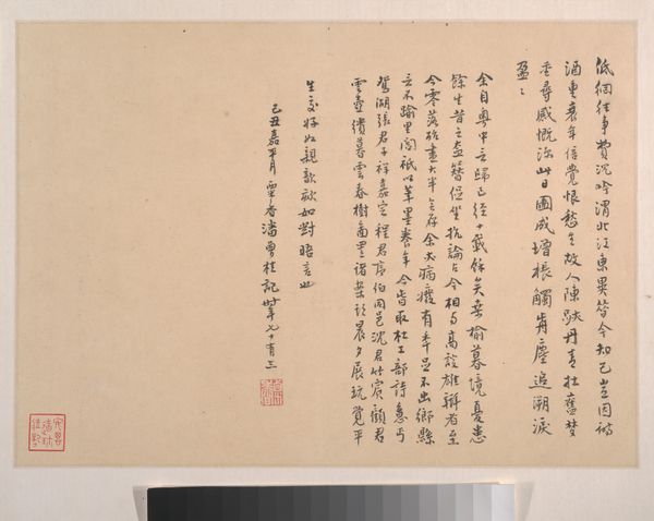 Editor: Here we have "Poems on Paintings, Written for Ma Yueguan" created in 1754 by Jin Nong. It's ink on paper and considered a drawing and example of calligraphy. The strong, confident strokes definitely create a mood of authority. How do you interpret the role of text within this image? Curator: Well, the text isn't just *in* the image; it *is* the image. Consider the literati tradition within which Jin Nong was working. Calligraphy was esteemed as highly as, or even higher than, painting. Writing poetry on paintings—often one's own—became a powerful way to inscribe meaning, circulate ideas, and cement one's social standing. Editor: So, the act of writing the poems becomes almost performative? An assertion of status? Curator: Precisely. Think about the intended audience, Ma Yueguan, and the other members of their social circle. These poems were meant to be shared, discussed, and even emulated. The art exists as part of a broader exchange. Do you think that changes our experience with it now? Editor: Definitely. Knowing that it’s part of a social and intellectual discourse makes me see beyond just the visual aesthetic. I mean, the visible red seals, likely chops belonging to collectors… They speak to that ongoing reception even today! Curator: Yes! The added layers from multiple owners and readers through the years contribute to a work’s biography. Thinking about this artwork helps us to explore the vital role of both text and social context in the creation and understanding of art.