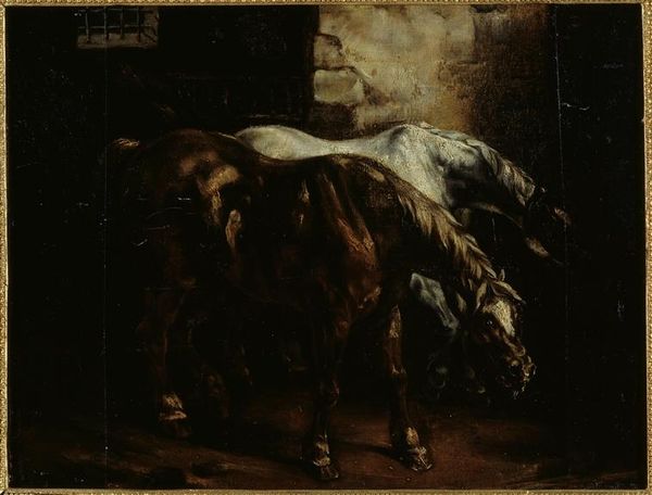 Curator: This is Thédore Géricault's oil painting, "Study for Horse turned right with three hens and a rooster," currently residing at the Musée Bonnat in Bayonne, France. What strikes you immediately? Editor: The raw energy, certainly. There’s an unrefined, almost volatile feel to it. The color palette contributes—lots of browns and ochres swirling together. It feels like a prelude, doesn’t it, a glimpse into a moment rather than a finished declaration. Curator: It speaks to Géricault's artistic process, definitely, this study's raw energy, as you say, is captivating. Look at the placement of the figures – the horse dominates the scene. He turned his gaze to the right while in the background are a rooster and two hens which represent domestic life and stability. Editor: Interesting, particularly as horses carried significant cultural weight. As military and farm animals they evoke ideas of power, prestige and wealth during the Romanticism period. Does the contrast undermine or heighten our appreciation of equine strength and prestige? Is Géricault suggesting even a symbol of such grandeur can’t exist outside the mundane? Curator: It's an insightful observation. Perhaps it shows even grand symbols exist within a system of interdependence. The Romantic movement saw the revival of Christian symbolism to question contemporary value and Géricault uses a traditional symbol with the same critical eye. Also, look closely, one of the hen is gazing at the horse’s hoof. She almost is expecting that horse's protection as their king. Editor: Yes! It humanizes the animal in such a fascinating way. The hens, they seem almost caricatures of everyday concerns while the horse… he embodies a sort of burdened nobility, nobly standing amidst chaos and expectations. It is an intersection where high and low meet in surprising harmony. Curator: A very astute point. By juxtaposing these figures Géricault masterfully illustrates how symbols acquire new nuances through different social forces. He reveals their vulnerability while at the same time he reinforces those enduring archetypes within human consciousness. Editor: It's pieces like these, studies, that often reveal more about the artist and the era than their finished works. I leave here feeling I've glimpsed behind the curtain, as it were. Curator: Absolutely, a study isn't just preparatory work. The canvas is where social, cultural and inner personal struggles engage in constant dialogue. This is where archetypes come to the surface for revisioning, as relevant today as it was then.