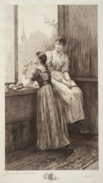 Curator: Mary Cassatt's "The Fitting," dating back to 1891, is rendered in pastel and pencil on paper. This privately held piece offers an intimate look into the everyday lives of women during that era. Editor: I'm immediately struck by the moodiness despite the pastel colors. It's like a scene caught in a hushed breath—a blend of quiet observation and underlying tension. The lines are soft, almost dissolving, which somehow amplifies the interiority. Curator: It's true, the pastel medium lends itself to capturing a sense of immediacy, but also fragility. Considering its era, this genre painting steps into Intimism, but the depiction is intriguing because of the symbols used here. Note, the fitting gown's colors—what do the light vertical bars signify, especially in contrast to the seated seamstress? Editor: It's all so delicately rendered; the pastel blurs offer the seamstress the grounded darkness, she isn't "ascending." Instead, we have someone tethered to the floor almost as if by responsibility while the patron lifts herself up, both figuratively and in appearance. There is a real ambivalence to their connection. Curator: Indeed! This brings to light several interesting facets. We are looking at a private moment. Yet there is an overt power dynamic presented through color. Are these stripes indicative of future expectations? Of change to come? Is that yellow more like sunlight to one and jaundiced to the other? Editor: Well, Cassatt's brilliance lies in depicting a universal female experience through such specific visual cues. I can almost smell the starch of the new dress and feel the nervous anticipation of its wearer. But you’re right to pick up on the subtle unease. It is about what isn't being said between these two individuals, each of them confined to certain stations. Curator: And that visual constraint is just what creates such depth, right? "The Fitting" is about more than clothes; it's a social study rendered in delicate strokes, revealing how dress and color dictate not just fashion, but function. Editor: Absolutely! And perhaps most brilliantly, we are able to appreciate that it wasn't intended to offer resolution; merely to reflect reality's textures. A reflection that leaves you lingering, questioning those fleeting moments we often take for granted.