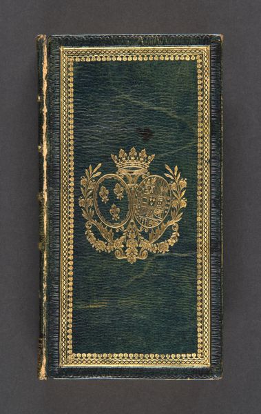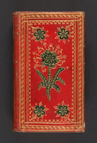 Editor: We're looking at "La dedvction de l'innocence de messire Philippe Baron de Montmorency..." from 1568, seemingly created by Jacques de Wesenbeke. It’s currently held at the Metropolitan Museum of Art. It looks like a book cover, with gold gilding over what appears to be leather. I'm struck by how intricate and decorative it is. How do you approach analyzing something like this? Curator: My interest lies primarily in the formal relationships within this artifact. Consider first the color palette: a vibrant vermillion red dominating the field, juxtaposed against the intricate gilded patterns. How does this contrast create visual interest, and how does the symmetrical composition influence the reading of the work? Editor: It does make it seem very balanced and ordered. It’s also quite striking how much the gold leaf catches the eye, especially with the symmetry you mentioned. Curator: Exactly. Note the repetition of floral and foliate motifs. This repetition creates a rhythmic visual structure. Moreover, consider how the central cartouche functions as a focal point, framed and set apart by the surrounding decoration. Can we decode this visual language? Editor: Is the darker oval in the center acting as an anchor for the eye? Almost like a window, framed by that elaborate golden decoration? Curator: Precisely. It arrests the gaze and invites closer inspection. This object represents a particular historical moment expressed through visual design, demonstrating formal and symbolic intentions. Editor: So you're suggesting its formal elements work to emphasize specific features and guide the eye across the work? The symmetrical gilded elements help build the story? Curator: Precisely. The arrangement of colors, shapes, and decorative devices all work together to contribute to the overall composition. Understanding this framework is key to appreciating its aesthetic and intellectual significance. Editor: I'm starting to see it less as just decoration, and more as a deliberate structure. Thanks! Curator: My pleasure. By examining these inherent artistic choices, we gain insight into its formal sophistication and design philosophy.