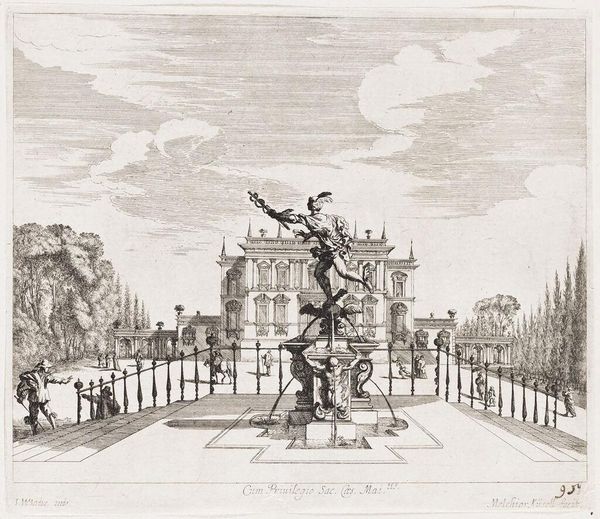 Editor: This is Melchior Küsel's "Portico and Stairway Leading to a Walled Garden WIth Pergola and Fountain." The precision in the etching is really striking! What do you see in this structured composition? Curator: Indeed. The composition is meticulously rendered. Note how the linear perspective and the play of light and shadow articulate the spatial relationships. Observe the geometrical arrangement of the garden elements. Editor: It's all so deliberate. I hadn't noticed how the lines create depth. Curator: Precisely. The very lines invite contemplation on the formal aspects of representation itself, wouldn't you agree? Editor: I think I understand better how the formal elements contribute to the impact of the piece. Curator: Good. The close examination of form is the key to understanding the artist's intentions.