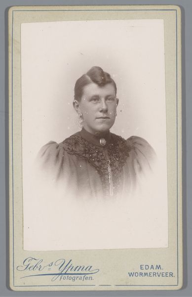 Curator: This portrait, taken sometime between 1878 and 1900, is simply titled "Portret van een jonge vrouw" and was created by Jacob Kuyper. Editor: My immediate impression is one of reserved formality; it's amazing how photography at that time both captured and constructed these societal roles. What about the process here intrigues you? Curator: For me, it's imagining Kuyper in his studio, meticulously arranging light and pose, but I'm also drawn to the subtle hints of color applied to the print. The delicate flush to her cheeks humanizes the stern demeanor so characteristic of the era's portraiture. What symbolic elements stand out to you? Editor: Definitely the framing, literally and figuratively. The oval shape softens what could be a rigid composition and gives the impression of a precious memento. The detail around the neck, so carefully captured, adds a layer of sophistication. It begs the question, what kind of life did this young woman lead? Curator: Absolutely! Think about the labor involved in her clothes and the creation of the photographic print itself—the developing chemicals, the photographic paper, each aspect deeply embedded within its own system of production. It prompts us to think about the unseen efforts propping up this genteel image. Editor: True. The lace in the artwork is an example of the rising manufacturing capabilities, the image thus becoming accessible to a greater public than painted works, but in many respects preserving the traditional composition techniques. I keep looking at her gaze; there's a distinct lack of vulnerability. Do you think the subject was conscious of participating in constructing this particular identity for herself? Curator: Certainly! She actively participated, which means she actively made a statement about herself for herself, but for others, too. Now, over a century later, what meaning do we now make of it? The question of whether or not our construction of reality today is equally valid is for anyone to reflect on. Editor: Looking closely has deepened my appreciation for the blend of control and intimacy within the photographic process itself; this is where our engagement ultimately begins and ends.