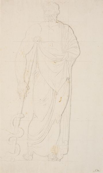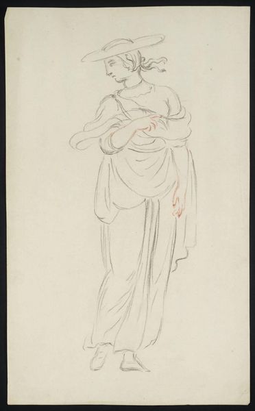 Editor: Here we have an untitled sketch by Prince Hoare, part of the Tate collection. It's delicate, just pencil on paper, depicting a woman in classical dress. What can you tell us about the context of this work? Curator: Considering Hoare's lifetime, late 18th to early 19th century, this sketch likely reflects the period's fascination with classical antiquity. The flowing drapery, the idealized form – it’s all part of a larger cultural trend, wouldn't you agree? How do you see this ideal reflected in the work? Editor: Yes, definitely. It feels like a study, perhaps for a larger, more formal piece intended for public display. Curator: Precisely! Its public function may have been intended to inspire virtue or civic duty, values prized in that era. Editor: I hadn't thought of it that way. It's interesting to see how even a simple sketch can be tied to larger social ideals. Curator: Indeed. It reminds us art never exists in a vacuum.