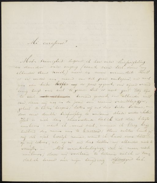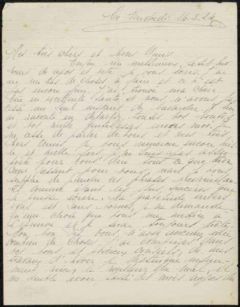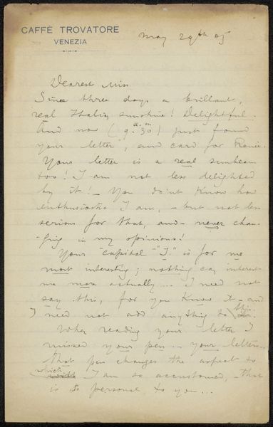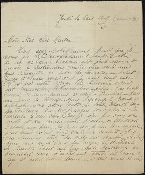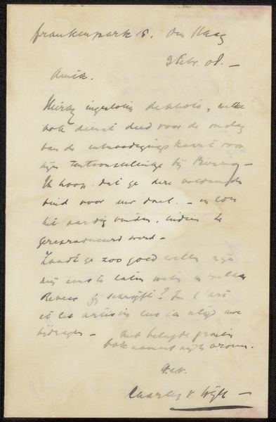 Curator: So, here we have Philip Zilcken's "Brief aan Elsie Maud Cownie," likely from 1906-1907. It's ink on paper, a seemingly simple letter. What strikes you about it? Editor: Well, it feels very intimate. I like the casual nature of a handwritten letter being considered art, almost like a snapshot of a moment. I'm curious, what is your interpretation of it? Curator: From a materialist perspective, the letter is more than just words. The paper itself, the ink used, the very act of handwriting—these are all deliberate choices, materials shaped by Zilcken's hand and available resources. What sort of ink do you think he used and how available would it have been? Editor: Probably something fairly accessible at the time, I imagine. Did the specific ink used have any bearing on its artistic reception, though? Curator: Precisely! This elevates everyday labor to the realm of art. It challenges the traditional hierarchy where painting or sculpture might be considered "higher" forms, simply because they require different, sometimes scarcer materials, or a "trained" skill. Consider, too, Elsie Maud Cownie; she likely had specific access to material (paints and canvases) because she herself was an artist. Editor: So, you’re saying the act of creating this, with these accessible materials, speaks to something beyond just the personal message. It highlights a connection with work? Curator: Yes! It reflects the broader culture of letter writing, the availability of materials like paper and ink. Moreover, it underscores labor. We can also consider who *wouldn't* have had access to these basic, now cheap, writing materials, thus examining historical context to better appreciate its inherent values. Editor: I never considered that aspect before. I was so focused on the emotional tone, but viewing it through the lens of material and labor changes my perspective completely. It’s not just about the message; it’s about the means of conveying it, and who had access to that means. Curator: Exactly! The mundane transformed through process and accessibility.