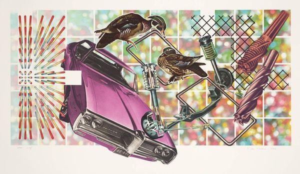 Editor: Here we have Peter Phillips' "Random Illusion No. 4," a large piece from an unknown date, residing in the Tate. It's quite the juxtaposition, isn't it? Birds of prey hanging out with engine parts and what looks like… candy? What am I even looking at? What do you make of this mishmash? Curator: It’s a visual feast, isn't it? For me, the “randomness” is the point. Phillips plays with the Pop Art sensibility of collage, where seemingly disparate elements collide. He's asking us to consider the connections we make between nature, technology, and even consumerism. The tubes, are they candy or something more sinister? Editor: Sinister candy! I love it. Curator: Exactly! It's all about the tension and unexpected harmony, a dance between the organic and the manufactured. The hard versus the soft. Editor: So, it's not about making sense but more about feeling the friction? Curator: Precisely! It's about opening your mind to the absurd poetry of modern life. Editor: That's wild; I came expecting order and found beautiful chaos.