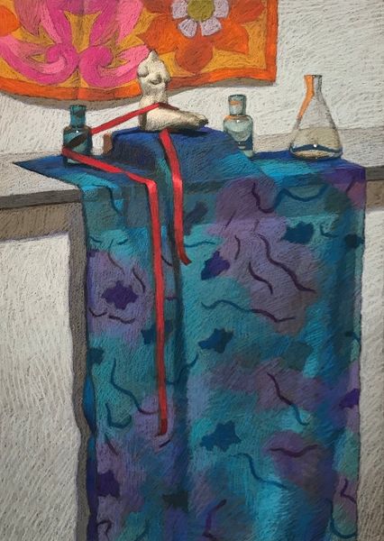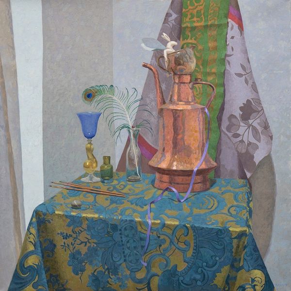 Melissa Hefferlin painted "Righteous," a still life, using oil on canvas. The objects are rendered with meticulous care, a copper jug takes centre stage. Yet, beyond the technical skill, the juxtaposition of the ordinary, domestic items, like pitchers, set against textiles with coded, maybe even esoteric, symbols asks us to reflect on the construction of meaning within cultural artifacts. The symbols can be read as a connection between the material and spiritual worlds. The piece reflects the cultural landscape of the late 20th century, marked by a renewed interest in spirituality. It speaks to the way we seek meaning through objects. The composition invites contemplation on the silent narratives that objects carry and their capacity to represent something beyond their physical form. "Righteous," with its quiet intensity, prompts us to consider the narratives that the material world weaves around us and the stories these objects silently tell about our collective search for meaning.
