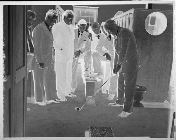 Curator: This image, currently known as "Untitled (hunters and officer looking at shotgun)," is part of the Harvard Art Museums collection and was created by Jack Gould. It's a small work, only about 4 by 5 inches. Editor: It’s strange, isn’t it? The reversal of tones gives it this eerie, almost dreamlike quality. Like a memory fading, or maybe a premonition. Curator: Precisely. Notice the central figure in uniform—he embodies authority, and yet the image itself, being a negative, undermines that authority, suggesting impermanence. The hunters, with their shotgun, become almost spectral figures. Editor: Yes, the uniform symbolizes order and control, yet the photographic reversal hints at a world where those things are inverted, questioned. It's as if the image itself is resisting a simple interpretation. Curator: It's a quiet disruption, a challenge to the assumed hierarchies. Editor: Absolutely, and that's what makes it so compelling. It's a subtle reminder that even in the most rigid structures, there's always room for questioning and re-evaluation.