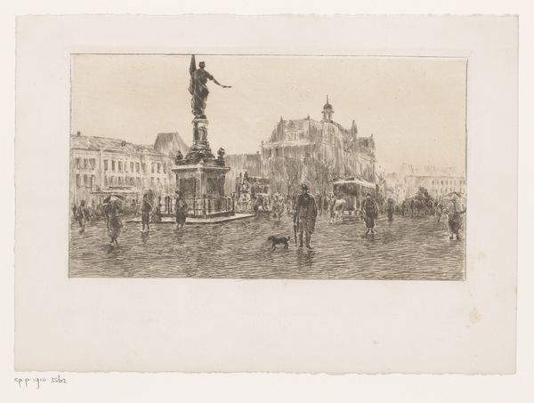Jules Guiette created this etching titled, *Gezicht op de Place de la Commune in Antwerpen*, capturing a view of the Place de la Commune in Antwerp. In the late 19th century, as industrialization swept across Europe, artists like Guiette grappled with the changing urban landscape and its impact on daily life. This work provides a glimpse into the bustling atmosphere of a city square, rendered with remarkable detail. Notice how the artist captures the somber mood with gray tones and the reflections on the wet ground. Figures with umbrellas move through the square. Consider how the presence of the statue looms over the scene and the figures are dwarfed by the architecture, perhaps reflecting a sense of individual insignificance in the face of modernization. Guiette seems to depict how the city—with its blend of commerce, culture, and civic life—shapes its inhabitants' experiences. *Gezicht op de Place de la Commune in Antwerpen* invites us to reflect on the relationship between individuals and the urban environment, prompting questions about identity and place.