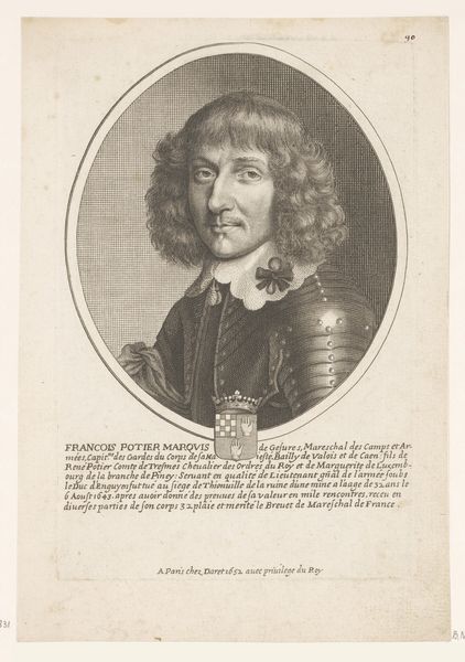 This is Pierre Daret’s portrait of Charles IV, Duke of Lorraine, made using engraving in the 17th century. The composition is dominated by an oval frame, which encloses the Duke in a formal pose. The sharp contrast between light and shadow defines the Duke’s features and attire, evoking a sense of gravity. Daret masterfully uses line and texture to convey the Duke’s status and character. The intricate details of his armor and the flowing lines of his hair contrast with the smooth, controlled lines of the oval frame. Semiotically, the frame acts as a signifier of containment and control, while the Duke's detailed presentation speaks to his power and nobility. The visual structure emphasizes the duality of freedom and constraint, reflecting the Duke's historical position as a powerful figure bound by political and social expectations. This tension, rendered through Daret’s formal choices, highlights the complex interplay between identity and representation in portraiture. Ultimately, it invites us to consider how such artworks were used to construct and reinforce social hierarchies of the period.