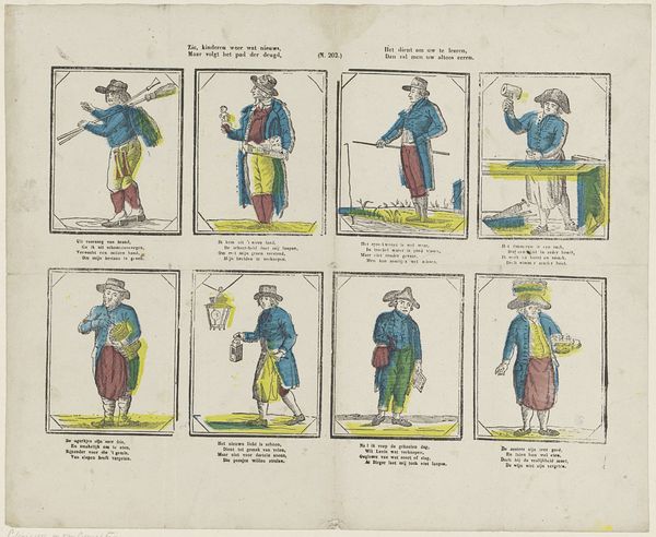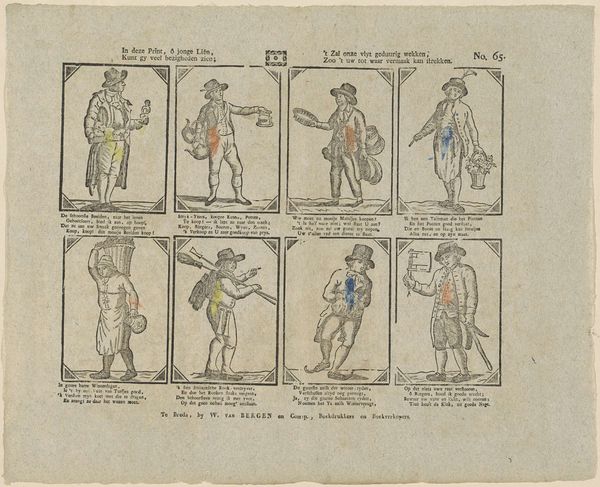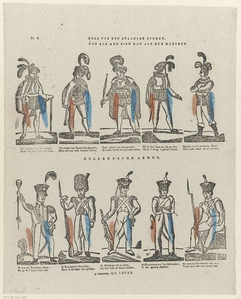 Curator: This print, entitled "Geen held, zoo dapper, kloek en groot / Of wenscht zich eenen bondgenoot (...)", which translates to "No hero, so brave, bold and great / Or wishes for an ally (...)," comes to us from Erve Wijsmuller and is dated between 1828 and 1913. It resides here at the Rijksmuseum. Editor: My first impression is a sort of charming rigidity. The figures are arranged like paper dolls, each confined to its own small stage. It has an almost naive quality that is appealing. Curator: The work is a print—an engraving to be exact—which situates it within a broader context of mass communication. Consider how these images of soldiers would circulate, shaping public opinion about national identity and perhaps even militarism during that period. We have to consider who controlled the narrative. Editor: I am drawn to the details of the uniforms. Each figure is slightly different, and it invites a comparative reading. It highlights an awareness of visual signs—how even minor variations in clothing could denote status, allegiance, and personal narrative. What might these signifying features suggest about Dutch society in this time? Curator: Well, the historical context is crucial. This was a time of great upheaval across Europe, with the Napoleonic Wars fresh in memory and new national identities solidifying. Images like this likely played a role in promoting patriotism and, of course, loyalty to the crown and military. Perhaps even justifying military spending? Editor: I also notice how neatly the figures are contained within their frames, creating an effect almost like specimens under glass. Do these enclosures signal, perhaps, social rigidity? The lines also feel like symbolic constraints—a lack of freedom of expression among the people perhaps? Curator: I agree. The constraints speak to larger social forces. These were hierarchical times and societies were not ready to welcome difference; images played a role in establishing social boundaries. Perhaps there's something profoundly melancholy, too, about these soldiers and their roles within it all. Editor: Yes, this melancholy hints at something unresolved, a sort of tension in the representation of military heroism that complicates the ostensibly patriotic message. It becomes a layered and thought-provoking visual experience. Curator: Absolutely. Seeing it through that lens really changes its whole impact. Editor: Indeed. A fresh perspective shifts the emotional resonance of the work.
