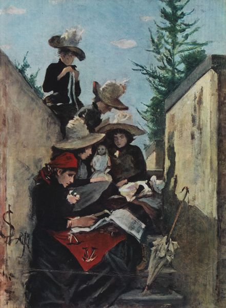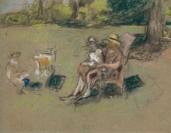 Isaac Israels created this artwork, Figures in a Park, using pastel on paper. Notice the powdery texture and soft edges, distinct qualities of pastel. Pastels consist of pure pigment, bound lightly together, which offers a direct way of applying color. Israels has used broad strokes to capture the light and atmosphere of the park. The figures are sketched quickly, focusing on their form and posture, rather than meticulous detail. The layering of pastels creates a sense of depth and movement, hinting at the bustling life of the city. The choice of pastels lends itself to the impressionistic style, where capturing the fleeting moment is paramount. The relative ease and immediacy of pastel allowed Israels to quickly record his observations of modern life, blurring the lines between sketching and painting, a technique associated with a more academic and labored process. By focusing on materials and process, we can see how Israels challenged traditional artistic boundaries. He elevated the everyday experience to a subject of fine art.
