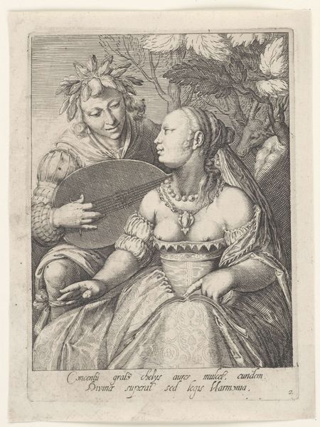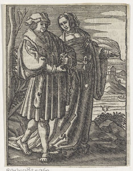 Curator: This delicate engraving, “Liefdespaar gezeten op een bank”, or "Couple seated on a bench", was created in 1529 by Heinrich Aldegrever. It’s currently held here at the Rijksmuseum. What's your initial take on this piece? Editor: There's a certain restraint in the scene, despite all the ornate details. The figures appear stiff, almost burdened by their garments and surroundings. I wonder about the social dynamics implied. Curator: Absolutely. Considering the period, the attire signals clear socio-economic standing, immediately bringing issues of class and gender to the forefront. The woman, though adorned, possesses a somewhat resigned gaze, a common visual strategy for depicting women within a patriarchal framework. Editor: Precisely! It’s fascinating to examine the craftsmanship. Look at the intricate lines creating textures of their clothes! The labor involved in producing such detail from a relatively small copper plate, intended for mass reproduction as prints, is noteworthy. Were these prints circulated among similar classes or intended to illustrate morals to the lower classes? Curator: Both, potentially. Prints like these served multiple functions. They provided aspirational images to lower classes and reinforced social order among the elite. And the objects surrounding them, such as the vessel that could contain drink and other finery, denote luxury and prosperity, underlining their status. Also, how do those items serve in gendered relation with the figures and what meaning can that produce for contemporary considerations? Editor: It’s all deliberately displayed wealth. The texture suggests these things were either produced using very fine or expensive tools. Consider the mining and the metalworking needed, also, to produce not only the original plate but also all these props. Curator: By focusing on such material aspects, you’re emphasizing the political economy interwoven into the seemingly intimate depiction of the couple. In a way, Aldegrever reveals how deeply intertwined displays of love, affection, and domesticity are connected to broader political and economic systems. Editor: The material conditions speak to an audience, of wealth, power, or both! How did these printed works dictate tastes? What labor went into producing the plate itself? The relationship of maker to product is interesting. Curator: So, thinking of all this labor then gives me new perspective on its message: this wasn’t a simple declaration of love; rather, a complex illustration of power dynamics, social class, gender roles, and, perhaps, even an insight into anxieties about marriage and legacy. Editor: Definitely. Now I am really wondering about how it got here!