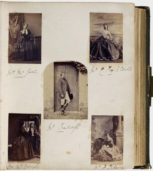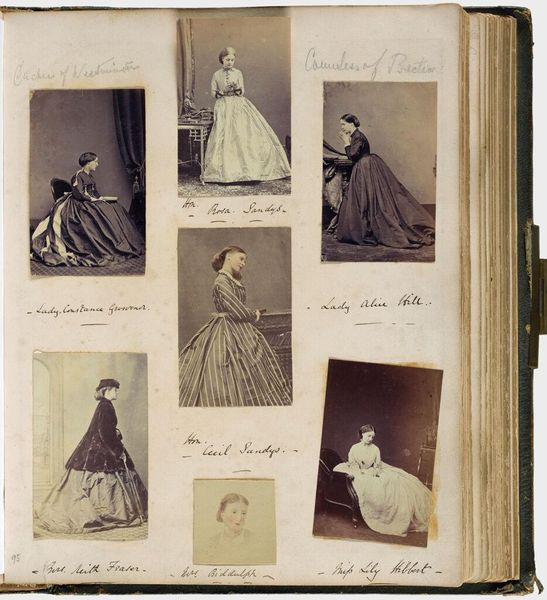 Editor: This fascinating page holds five photographs by Mary Georgiana Caroline Cecil Filmer, showcasing various women of the time. The album-style presentation gives it a personal, almost intimate feel. What kind of cultural symbolism do you see in this collection? Curator: The grouping itself is significant. Consider the ritual of portraiture. What does it mean to carefully arrange these images within a page? The poses and elaborate dresses speak volumes about status, but also hint at an internal performance of identity for the camera and for posterity. Do you find a shared visual language between them? Editor: I see the emphasis on dress and stature; their placement definitely suggests a hierarchy or connection between the subjects. Curator: Exactly! It is a tableau vivant, each woman a symbol in a carefully constructed narrative about femininity and social standing during that period. Editor: I never thought about photographs as symbols before.