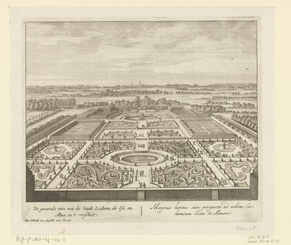 Curator: Looking at this print, my initial reaction is of order and control, perhaps even sterile in its precision. Editor: That’s a perfect first impression. This is "View of Honselaarsdijk Palace in Bird's-Eye Perspective", attributed to Cornelis Danckerts II, though precisely dating it is a challenge—sometime between 1696 and 1774. It’s an engraving, offering a detailed, almost diagrammatic portrayal of the palace and its vast surrounding gardens. Curator: Bird's-eye views like this were a deliberate technique to convey not only the scope but the symbolic domination over the landscape. The ordered gardens, the precise angles... It suggests a very specific mindset. It gives visual form to power structures, right? Editor: Absolutely. This perspective reinforces the idea of human mastery, literally overseeing and shaping nature to fit an ideal. Honselaarsdijk itself was not merely a residence, but a statement of power, privilege, and Dutch identity in that era. Curator: I am thinking of the patterns repeating within patterns, drawing my eye deeper. Does this remind us of the mandalas used to represent a microcosm of cosmic order, bringing to mind this feeling of universal balance, echoed through the gardens' structure and even its architecture. Editor: That's a great observation. Though secular in its immediate purpose, such rigidly ordered designs still tapped into that deep human desire for order and harmony, reflecting a very specific class ideal. What do you suppose it said to everyday people? Curator: Probably something about an unachievable harmony, perhaps reinforcing their roles. However, beyond any statement, prints like this acted as records of the human capacity to transform environments and imagine them into visual systems. Editor: And thinking of who created this, it emphasizes their agency. They become an intrinsic part of that history. It leaves us thinking about the impact, intent, and who benefited. Thanks for adding insight to this image's complexities. Curator: Of course. What’s great about symbols and images is the power of them. What stories can an image contain if you truly delve into its many forms? It is a doorway to better understand society and culture.