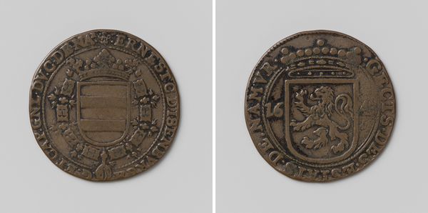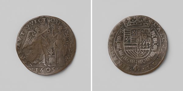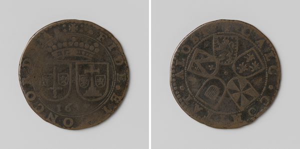 Curator: Looking at this coin, "Filips de Schone en Johanna, koningen van Leon en Castilie," dating from 1504, it's remarkable how much political narrative can be condensed onto a small metal relief. The layered symbolism must have been easily readable at the time. Editor: Absolutely. The initial impression is power and ambition, yet something feels undeniably brittle. The detail feels crowded, almost aggressively asserting dominance within such a constrained space. How would this have been received beyond courtly circles? Curator: The politics of imagery here are fascinating. Coins were a primary form of disseminating royal power and legitimacy, weren't they? Consider this: the depiction of Philip the Handsome and Joanna of Castile, King and Queen, being circulated as currency. It's about visibility, public acceptance, and, ultimately, the material reality of their reign impacting the everyday lives of their subjects. Editor: Indeed. Considering their subsequent history – Joanna's mental health struggles and Philip's premature death – this coin becomes a powerful, albeit potentially misleading, piece of propaganda. It presents a stable image of the monarchy even as personal turmoil loomed. How does the very choice of metal affect the image they are trying to promote? The medium, as we often say, becomes the message. Curator: Well, the metallic medium adds to its intrinsic value, of course, but beyond pure economics, I believe the coin's durability spoke to a supposed permanence, an eternal presence the rulers desired. Though its materiality offers us the knowledge that their presence was brief, and Joanna experienced immense suffering through no action of her own. Editor: Precisely. Seeing the coin today underscores the fragile and contingent nature of power. I will never see coins the same way again. Curator: Understanding its symbolism through their actions certainly enhances my interpretation of its form. It leaves us with more than just understanding about monetary history; it offers perspectives on royal image crafting and the weight it carries.