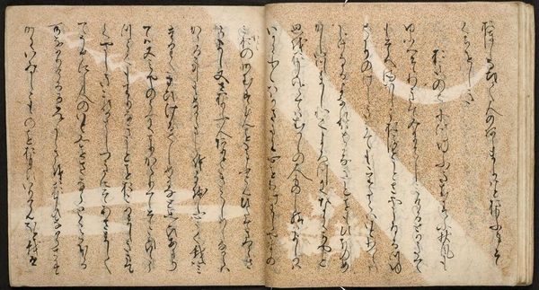 Curator: Here we have an open book, showcasing calligraphy titled "Suma, Chapter 12 of the Tale of Genji (Genji monogatari)," in the style of Monk Jien. Editor: Whoa, that script is intense! Like black ink vines crawling across a parchment landscape. I can almost feel the writer's hand, the controlled frenzy. Curator: Indeed, the Tale of Genji is a cornerstone of Japanese literature, and Jien was a poet and Buddhist monk during the late Heian and early Kamakura periods, a time of significant social and political transition. This work is now held at the Harvard Art Museums. Editor: Transition, huh? Makes sense. There's a tension in that flow, a sense of stories wanting to burst out, to spill secrets. You can feel the weight of history, but it’s all happening right now in these brushstrokes. It's quite stunning, really. Curator: It's a fascinating intersection of text, image, and historical context, a window into a world that continues to resonate today. Editor: Exactly. It makes me want to pick up a brush and try to capture my own chaotic story—though I doubt it would look as elegant.