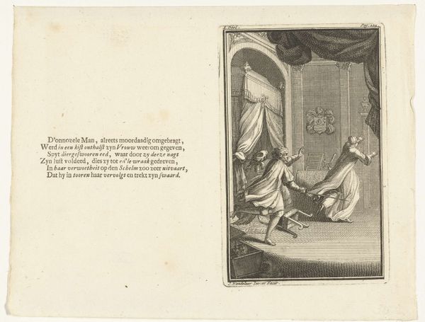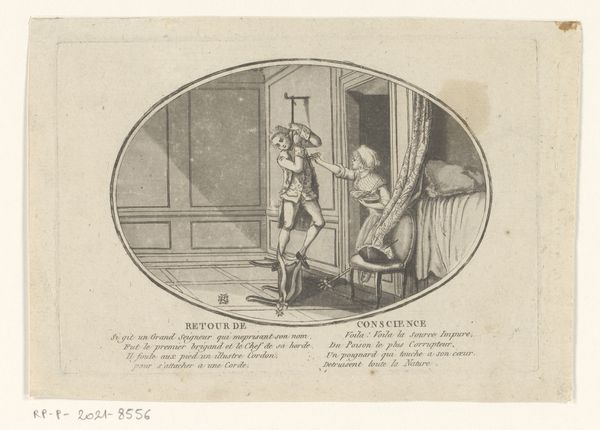 Editor: So this is Daniel Nikolaus Chodowiecki's engraving, "Yorick overdenkt het leven terwijl hij zijn bagage rond rolt," from 1783. He's contemplating life, baggage and all. I am immediately drawn to the satirical mood—the juxtaposition of Yorick's profound reflection with the mundane act of lugging luggage seems quite amusing. What do you find most captivating about this particular work? Curator: Captivating indeed! It tickles my funny bone in a very philosophical way, doesn’t it? I’m most struck by Chodowiecki's ability to capture an introspective moment amidst the ordinary. The romantic era, the quest for profound meaning amidst everyday experience. I find that delightful. Look closely: Yorick is mid-stride, a picture of contemplative weariness, while surrounded by symbols of transient pleasures – the remains of a meal. Tell me, what might those remnants of the meal signify? Editor: Perhaps a comment on the fleeting nature of worldly satisfaction? Even in consumption, there's a melancholy awareness that it's all temporary? Curator: Precisely! And doesn’t that resonate with the heavy 'baggage' of life we all seem to carry, pondering, like Yorick, the what-it-all-means of it all? This seemingly simple drawing invites a cascade of thoughtful musings. It whispers a knowing truth about the human condition, all wrapped up in an amusing package. It makes me want to laugh and cry all at once. Editor: It really does, doesn't it? It's much deeper than I initially gave it credit for. The symbolism combined with the humor makes it quite potent. Curator: Indeed, a pocket-sized prompt to not take ourselves too seriously while taking life very seriously. And that, I think, is a lesson worth carting around with our own baggage. Editor: I agree. It makes you wonder what kind of baggage *we're* all hauling around.