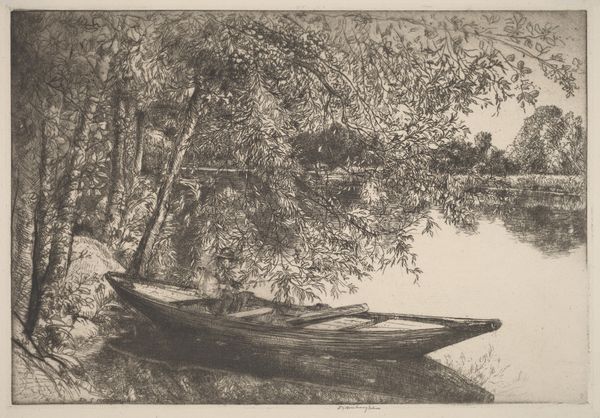 Editor: This is Adolphe Appian's "Pêcheur en Canot, au bord d'une Rivière (Fisherman in a Boat)," made in 1887. It's an etching. There's such a serene feeling here. The solitary figure of the fisherman… I’m curious about the process of etching. How did Appian achieve this atmospheric effect? Curator: That atmospheric effect speaks volumes about Appian's material process. Look closely; the etched lines vary in depth and density. He was manipulating the copper plate itself, using acids and stopping-out varnishes to control the bite. This isn't just about representation, it’s about *making* the image. Editor: So, the process itself informs the artistic outcome. The etching relies on industrial methods, using chemical reactions… Curator: Exactly. And consider the implications of producing multiples. Etchings allowed for wider dissemination of imagery, influencing taste and accessibility. How does the reproducibility influence its meaning and impact, do you think? Editor: It removes it, perhaps, from the singular aura of a unique object, but inserts it into circulation as part of everyday visual culture. Instead of art for the wealthy, the means of production allow it to be spread. Curator: Precisely. Think about who had access to these images. Were they hung in parlors? Did they circulate among artists? The value isn’t just in the image, but its potential use and social impact. The labour and materials – metal, acid, ink – are also indicators. Editor: I hadn’t considered that before. It’s not just about what's depicted, but how and for whom it was produced. Thank you. Curator: Indeed. Art exists within a web of material conditions, which in turn informs its content.
