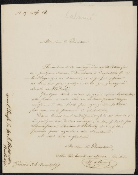 Curator: So, what's catching your eye today? Editor: We're looking at a letter, “Brief aan Ary Johannes Lamme,” thought to be from around 1861 to 1863 by Dirk Vis Blokhuyzen. It's made with pen and ink, and I find the cursive script itself so compelling. What draws your attention in this work? Curator: I'm most interested in the labor embedded within the letter's production. Consider the cost and availability of paper and ink in the mid-19th century. The act of meticulously forming each letter by hand transforms this letter into a unique object, embodying a particular materiality. How does this shift your understanding of the work? Editor: That’s an interesting perspective. I tend to focus on the content of the letter but thinking about the means of making shapes the content. This brings up questions regarding how accessible letter-writing was, depending on where one stood in society. Do you consider calligraphy a craft, a skill, or a form of art? Curator: Absolutely. The labor and the social implications of who could produce and consume such objects, challenges the rigid separation between fine art and craft that art history has imposed. Who had access to literacy? What were the politics of communication during this period? Editor: It feels much richer than just a simple letter now! Thinking about the materiality opens up many more avenues for interpretation. Curator: Exactly! And it also compels us to reconsider what is deemed worthy of preservation and exhibition. Editor: I will keep my eyes open for the labor, context, and cultural impact implied in what I consider "art" moving forward.