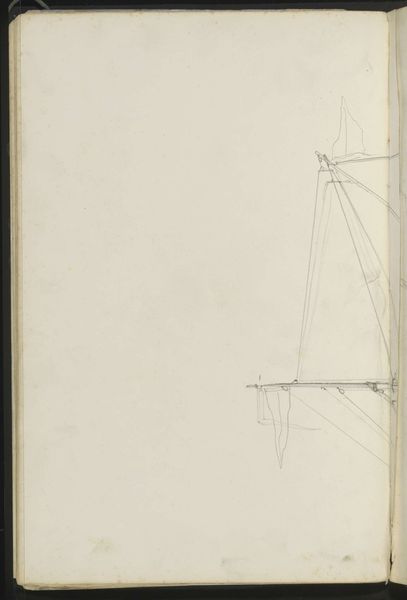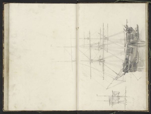 Curator: Welcome to the Rijksmuseum. We are standing before Johannes Christiaan Schotel's "Zeilschepen op kalm water," dating from about 1797 to 1838. The medium appears to be primarily pencil and pen. Editor: It's ghostly. There’s such quietude to it, despite the subject. The pale ground and light application of the strokes evoke a dreamlike stillness. Curator: Precisely. Notice the artist's use of line – the delicate, almost hesitant strokes to define the rigging and the hulls of the sailing ships. See how he uses hatching and cross-hatching to suggest depth and form, without resorting to heavy shading. Editor: I wonder about these ships in their specific moment. Maritime trade shaped much of this era, and ships facilitated global exchange but also carried the burdens of colonization. Curator: Absolutely, and we should also observe that Schotel here privileges formal clarity over naturalistic representation. The lines aren’t attempting a photorealistic image of the ships. They're far more evocative, capturing their essence. Editor: But can we separate that essence from the social realities that shaped its construction? Schotel might emphasize formal elements, but his artistic decisions would always be deeply entwined with social, historical, and cultural influences. These are not just sailboats in still waters; these vessels symbolize an era marked by profound change and conflict. The choice of subject reveals particular interests in a moment when ship-borne commerce and colonialism defined geopolitical relationships. Curator: An interesting counterpoint to be sure. Nonetheless, look closely at the top section, where the artist experimented with rendering the ships. This visual articulation of varied designs underscores the significance of structure. Editor: True, a comprehensive understanding means integrating context and form and letting it push back on the comfortable distance we might feel from a simple seascape. It compels me to consider these ghostly shapes and see them with fresh, more critical eyes. Curator: A worthwhile call. What I see in Schotel's art, ultimately, is a meditation on shape and form. Editor: And in doing so, invites further questions that demand context. Thank you.