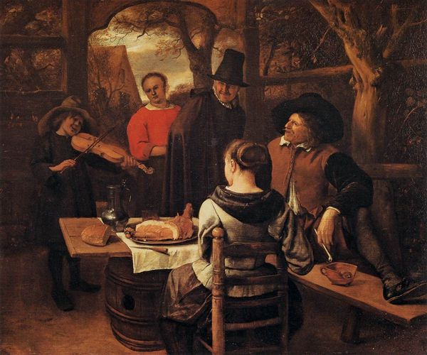 Jan Steen painted this scene of domestic chaos, capturing a raucous gathering that overflows with symbolic gestures. The figures are animated, their faces alive with expressions that speak to deeper truths. Consider the motif of the overflowing feast; observe that roasted fowl reappear throughout art history, from ancient Roman banquets to medieval feasts, symbolizing abundance and the transience of earthly pleasures. The image of the child tugging at the mother’s garment, as if urging her to leave, appears also in depictions of the biblical Flight into Egypt. These aren't merely scenes, but repositories of cultural memory, resonating across time. Such emotional intensity is not confined to this single canvas; it echoes through the ages, a reminder of our shared humanity and the timeless drama of human existence. The cyclical nature of these symbols reminds us that history is not linear but a spiral.