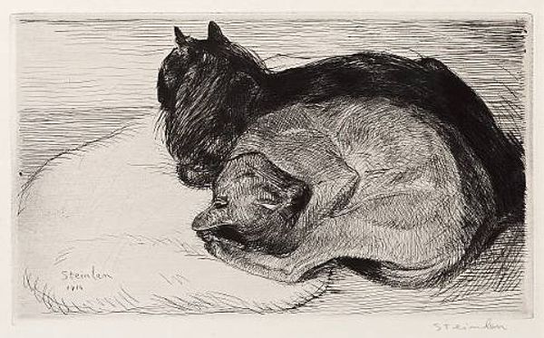 Editor: Here we have "Two Sitting Cats" by Théophile Alexandre Steinlen. It is a print, etching and drawing on paper. I’m immediately drawn to the textures and the contrasting light and dark areas. The way Steinlen captured the animals' forms is just wonderful. What catches your eye? Curator: The composition, first and foremost, strikes me as meticulously constructed. Notice how the upright cat and the reclining cat create a pyramidal structure, grounding the piece. The linear elements of the wooden structure beneath provide a stark contrast to the organic forms of the cats. What do you make of Steinlen’s choice to leave large portions of the background untouched? Editor: It brings more attention to the cats themselves and makes them seem like the focus is the material form rather than context. Curator: Precisely. He has intentionally minimised any extraneous detail to emphasise form and texture. Look at the varied linework in the etching - the delicate hatching creates a palpable sense of volume and weight, no? How does Steinlen use line to create shape and form in these figures? Editor: You can really see the different directions and densities in the lines and curves create different shapes and darker and lighter shading, depending on how dense they are. It's clever! Curator: Quite so! Note the heavier lines defining the contours, giving weight to the feline forms, whilst the lighter hatching creates nuanced shading, modelling the surfaces. A masterful example of the medium used to create form! What initially seemed like a simple depiction is, upon closer examination, a complex arrangement of line, form, and texture. Editor: I agree. I initially appreciated it for its representational qualities, but understanding the interplay of the formal elements really elevates it. Curator: It's a work that rewards close and careful observation.