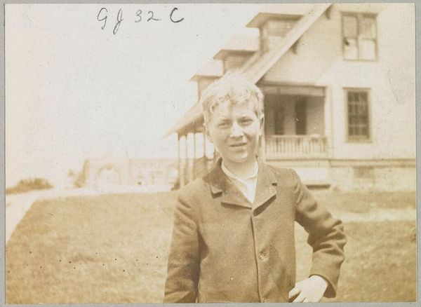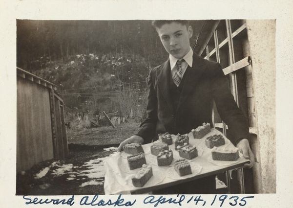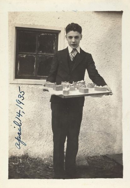 This photograph, inscribed "13 yrs old. April 14, 1933", presents a study in monochromatic tones and geometric forms. The subject, a young boy, is centered, holding a rectangular cake emblazoned with the name "Edward." The composition emphasizes the interplay between light and shadow, which defines the boy's features and the architectural backdrop. Note how the rigid lines of the house siding contrast with the soft curves of the cake's decorative trim and the boy's clothing. This opposition generates a visual tension, a subtle destabilization of formal expectations. The photograph’s muted palette evokes a sense of nostalgia, while the clear inscription anchors the image in a specific time. It freezes a moment in the subject's life, prompting reflections on identity, aging, and the human relationship with time itself. The inscription serves as a structural element, framing the image with historical context and challenging its reading as a purely aesthetic object.